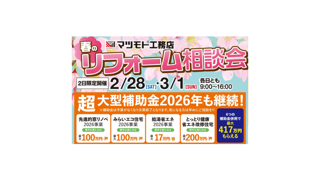 春のリフォーム相談会 ◆開催日 2026年2月28日(土)・3月1日(日)◆時 間 9:00~16:00◆会 場 マツモト工務店(鳥取市千代水3丁目59番地) そのリフォームちょっとまって!自費だけでリフォームしようとし […]